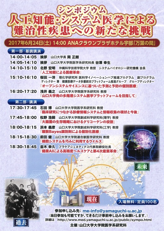 北野宏明先生、桜田一洋先生を基調講演にお招きし、シンポジウム「人工知能・システム医学による難治性疾患への新たな挑戦」を開催致しました。